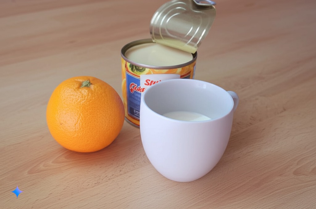 1-Comece separando os ingredientes para a sua Calda de Laranja: Receita Fácil e Deliciosa! Você pode usar suco de laranja pronto, mas o suco natural garante um sabor mais autêntico e evita que a calda fique muito doce caso o suco já contenha açúcar. Usei meia lata de leite condensado para 200 ml de suco de laranja para uma calda com sabor intenso de laranja. Mas se preferir uma calda mais doce e suave, use a lata inteira de leite condensado para a mesma quantidade de suco – a escolha é sua!