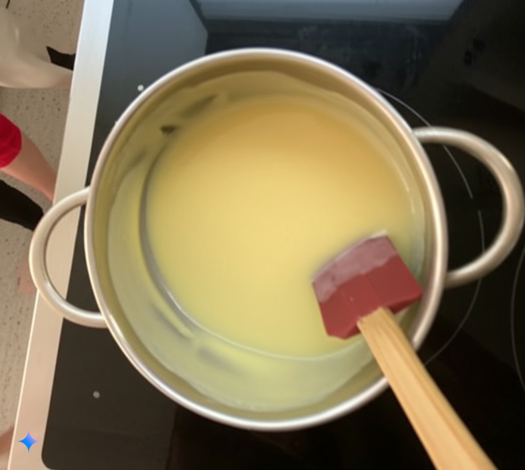 5-Mexa bem a calda em fogo baixo até que ela comece a ferver e desgrudar do fundo da panela, como um brigadeiro. O ponto ideal é quando a calda desgruda do fundo, como um brigadeiro mole ou de colher.