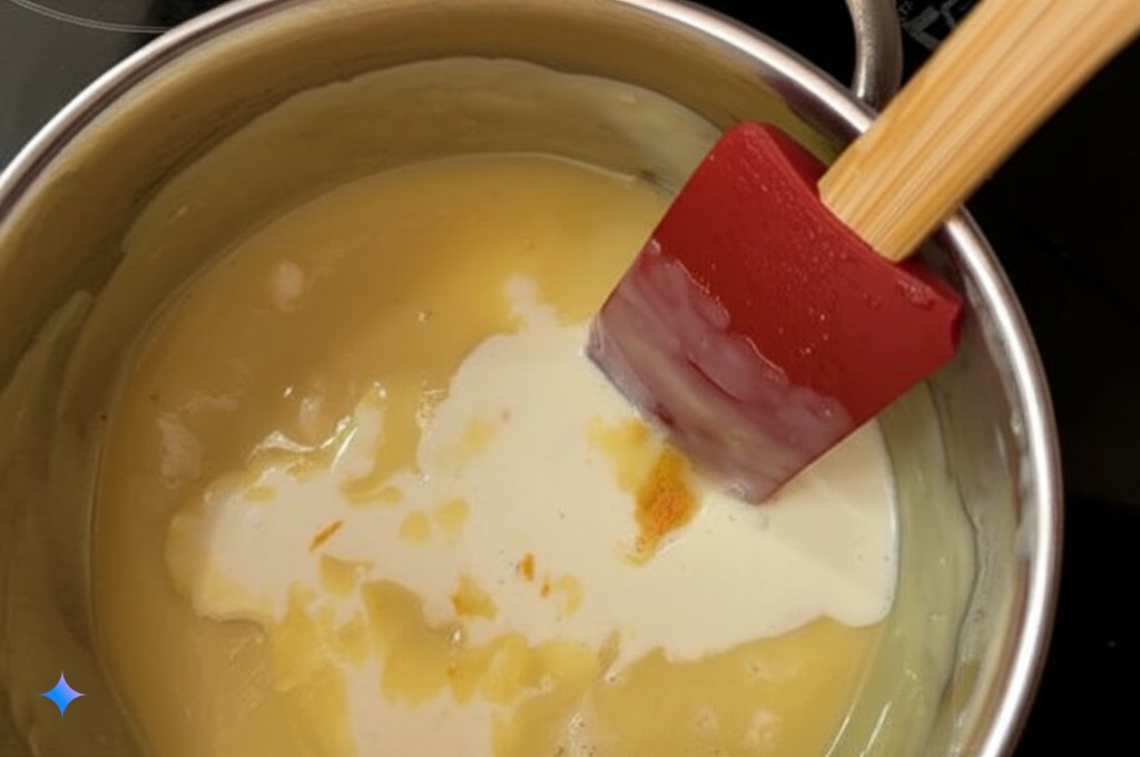 4-Em uma panela, ainda com o fogo desligado, misture o leite condensado e o suco de laranja até obter uma mistura homogênea. Lembre-se: as raspas de laranja entram só no final para evitar que amargurem.