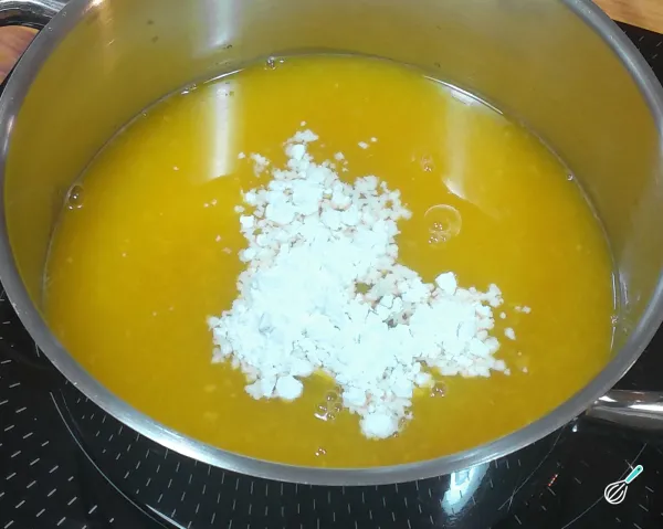1-Para começar a preparar essa calda de laranja cremosa, coloque o suco de laranja numa panela. Adicione o açúcar e a maisena peneirada. Misture tudo delicadamente.