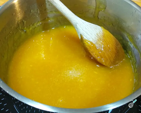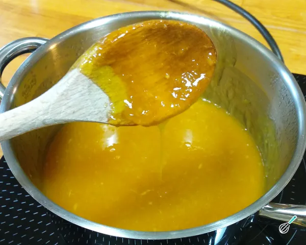 3-A calda estará no ponto certo quando ficar espessa e aveludada. Você perceberá isso ao conseguir ver o fundo da panela ao passar a colher, e ao levantar a colher, a calda escorrer em fio contínuo. Desligue o fogo nesse momento.