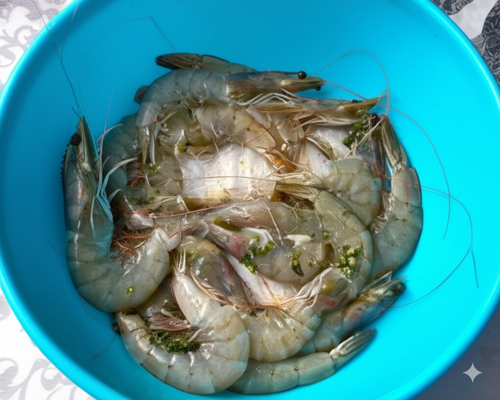 1-Lave muito bem os camarões com casca, removendo todos os resíduos, como areia e pedacinhos de casca soltos. Se os camarões ainda estiverem congelados, espere descongelar completamente antes de temperar.