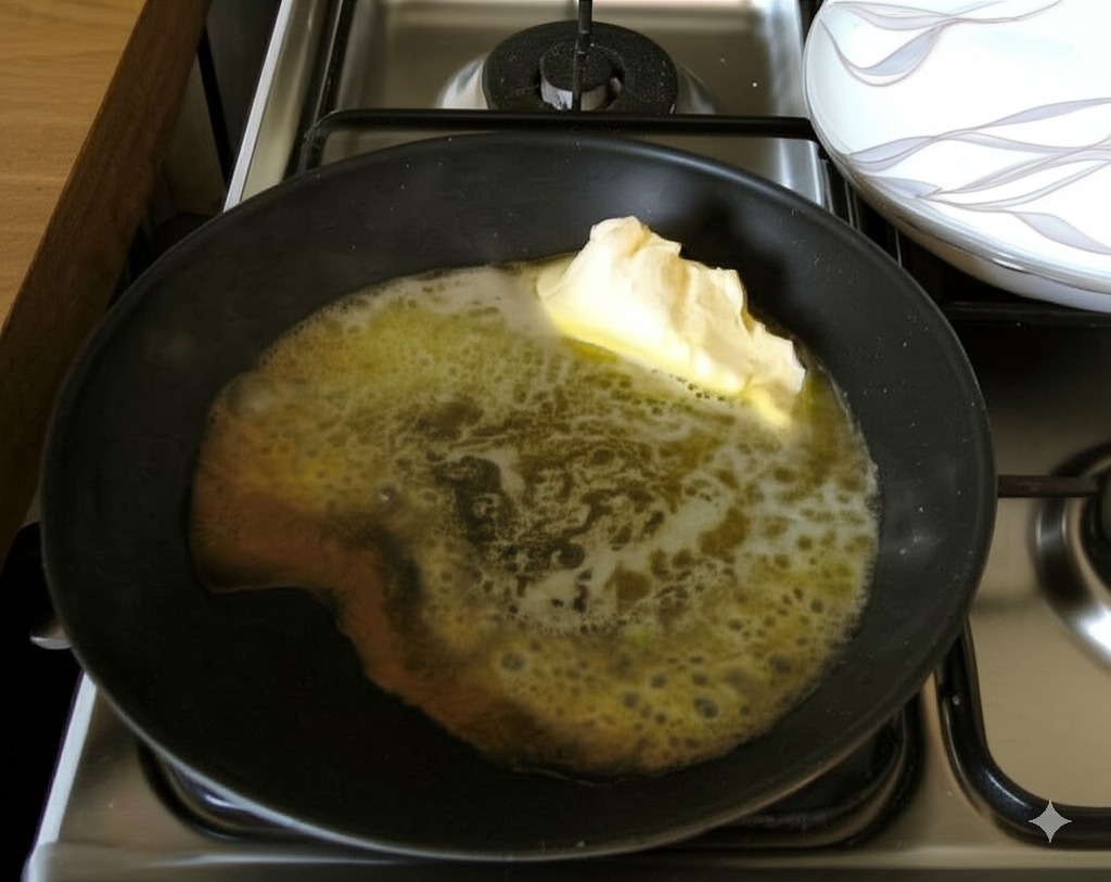 3-Em uma frigideira grande, leve ao fogo médio a manteiga e o azeite. Espere a manteiga derreter antes de adicionar os camarões.