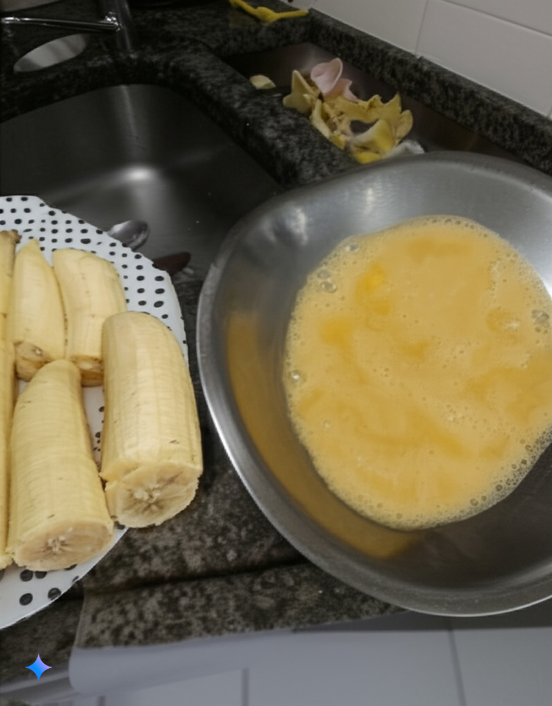 2-Hora das bananas! Descasque-as, corte-as ao meio e prepare-se para a empanagem perfeita: farinha de trigo, banho de ovos e, por fim, um mergulho na farinha de rosca. Frite em óleo quente até dourarem e deixe escorrer em papel absorvente. Uma explosão de sabor e textura!