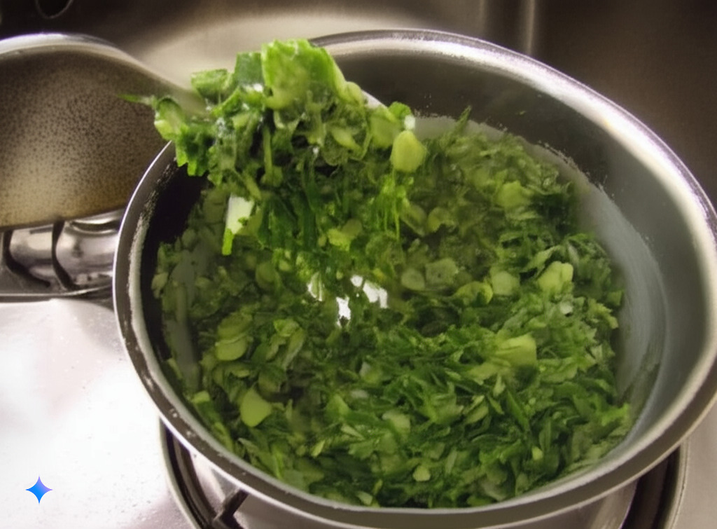 3-Continuamos nossa jornada rumo ao virado à paulista tradicional: corte a couve em tirinhas finas e refogue em fogo médio com óleo e alho. Assim que murchar, tempere com sal e pimenta-do-reino. Uma simplicidade que encanta!